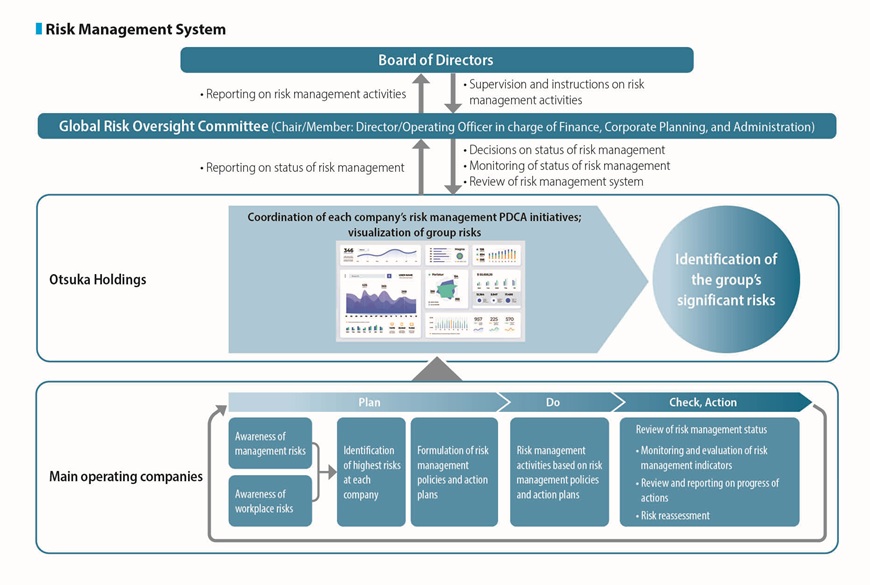 The Otsuka group recognizes that pursuing management efficiency and controlling the risks inherent in business activities are important for improving corporate value. For this reason, it is vital to establish a group-wide system that enables all executives and employees to swiftly uncover, identify, and deal with risks related to their work. The Otsuka group manages risk via the initiatives outlined below, under the supervision of top management.