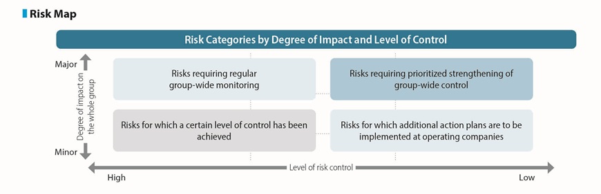 The Company aggregates and visualizes the significant risks faced by each group company to grasp a comprehensive understanding of the existing risks and the status of controls in the group. Common risks that apply to the whole group are studied closely and the significant risks are gathered and identified. Based on the results of this process, the Global Risk Oversight Committee assigns priority to significant risks that could a have significant impact on the group’s business, such as financial losses or business continuity.